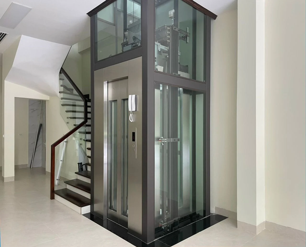 Chất liệu, hoa văn cửa tầng: Inox bóng gương, inox ăn món hoa văn, thép cường lực vàng/trắng, thép cường lực vàng/trắng, inox mờ vàng/trắng, kính cường lực, khung nhôm/thép.